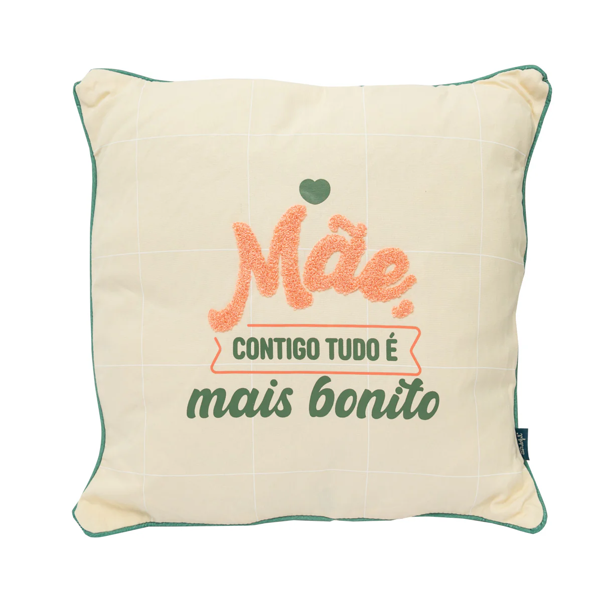 Almofada fabricada em algodão com mensagem para mães, inclui enchimento. Com fecho de correr, para poder ser facilmente lavada.