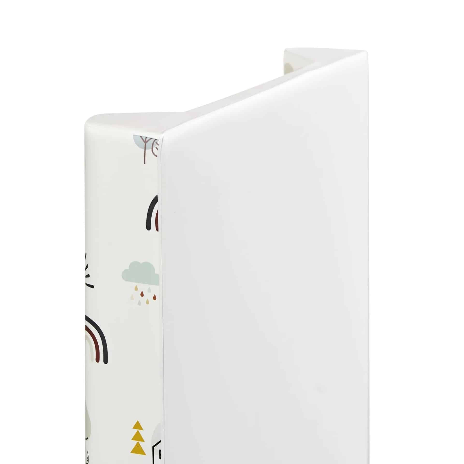 Está hecho de gomaespuma plastificada, sin estructura rígida, lo que lo hace fácil de limpiar. Su diseño flexible permite cambiar al bebé de forma segura sobre cualquier superficie.