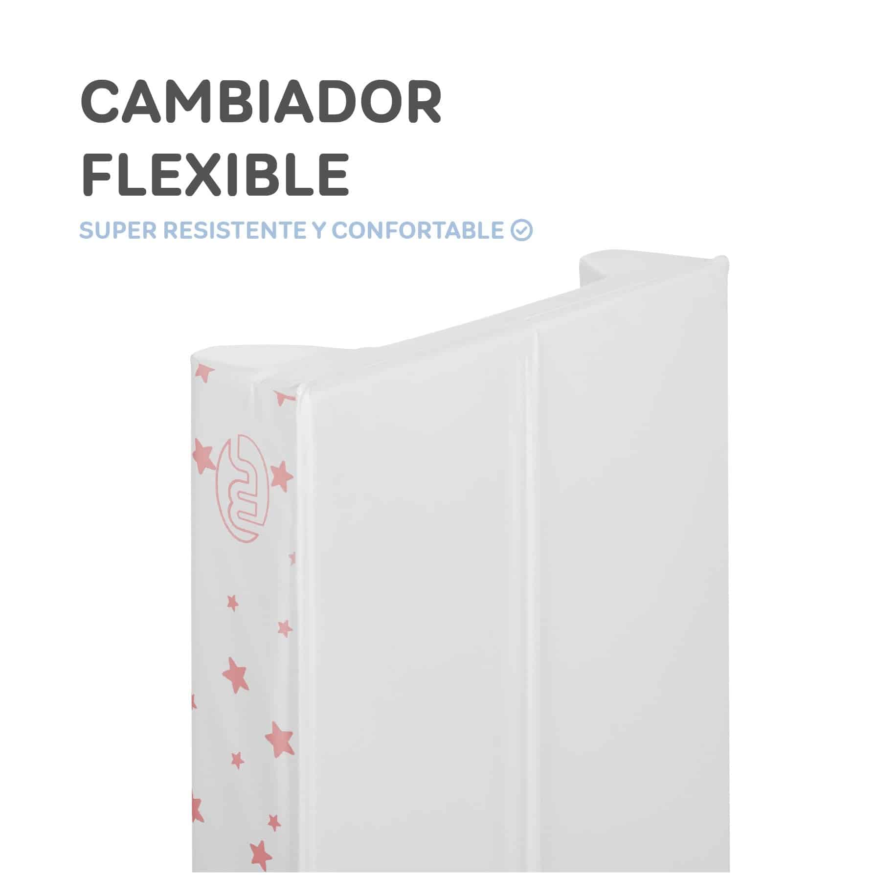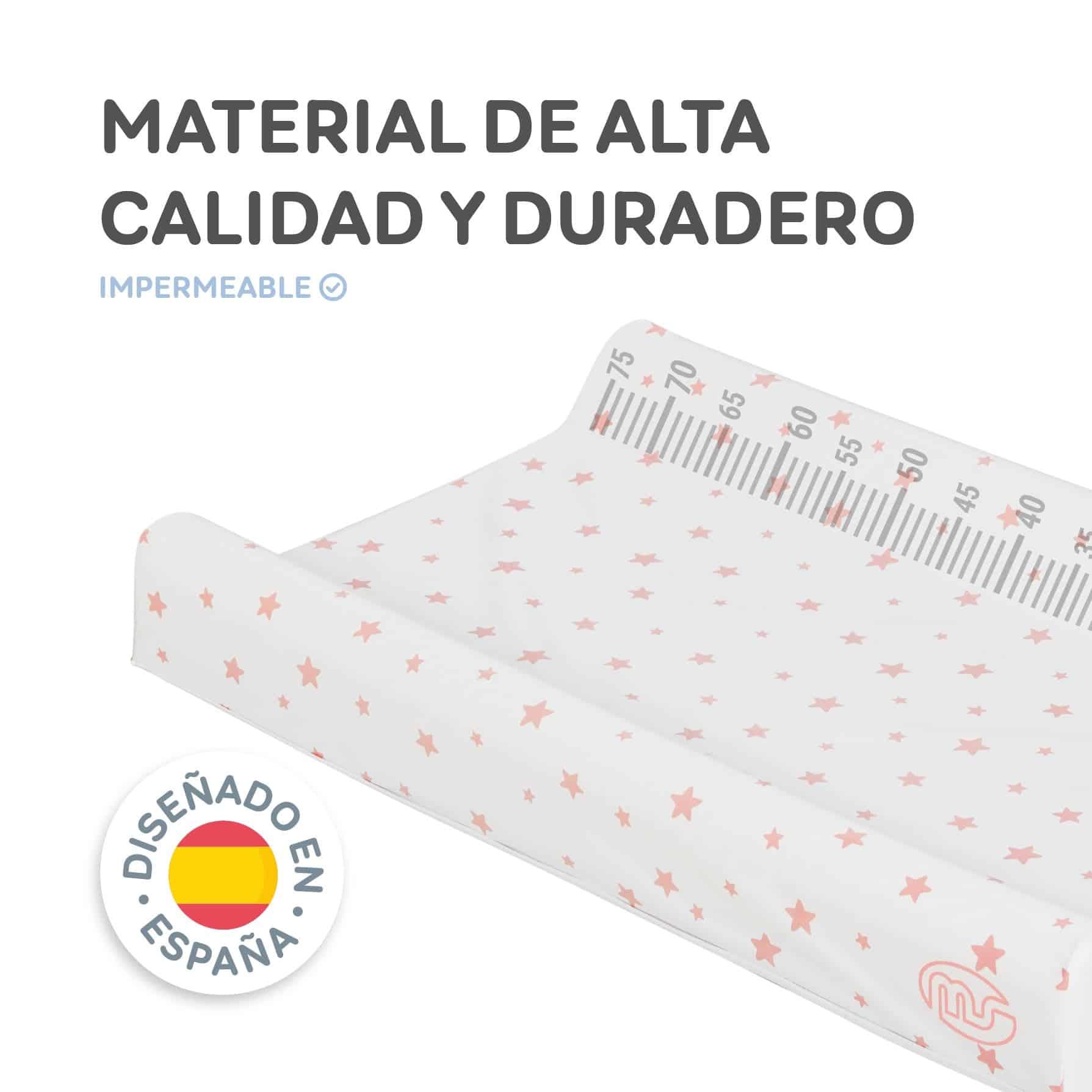 Está hecho de gomaespuma plastificada, sin estructura rígida, lo que lo hace fácil de limpiar. Su diseño flexible permite cambiar al bebé de forma segura sobre cualquier superficie.