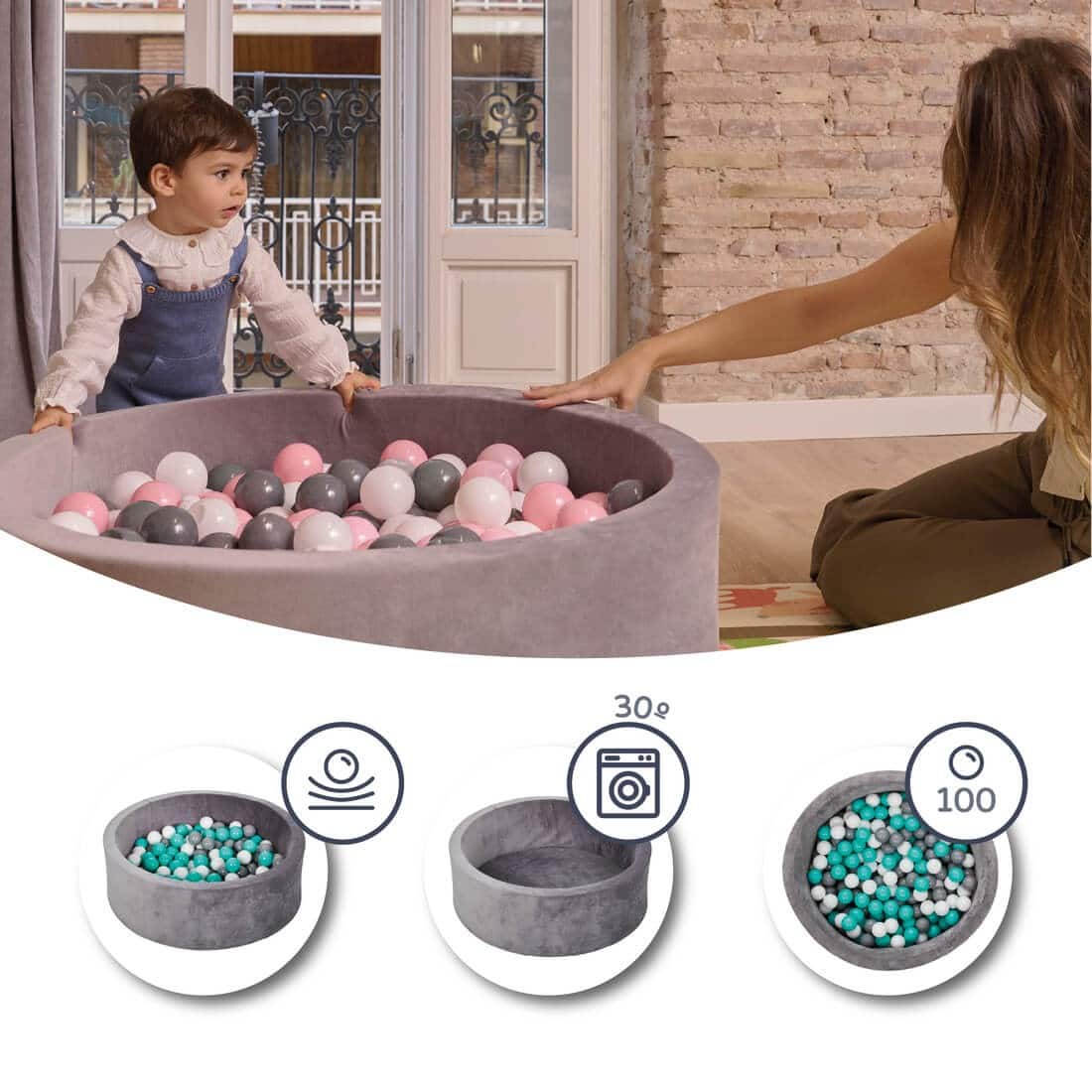 Con un diámetro de 90 cm y 30 cm de altura, incluye 100 bolas de colores que estimulan la coordinación, el desarrollo sensorial y la motricidad del bebé. Su diseño ligero permite moverla fácilmente por la casa, y las paredes y base acolchadas garantizan un juego seguro.