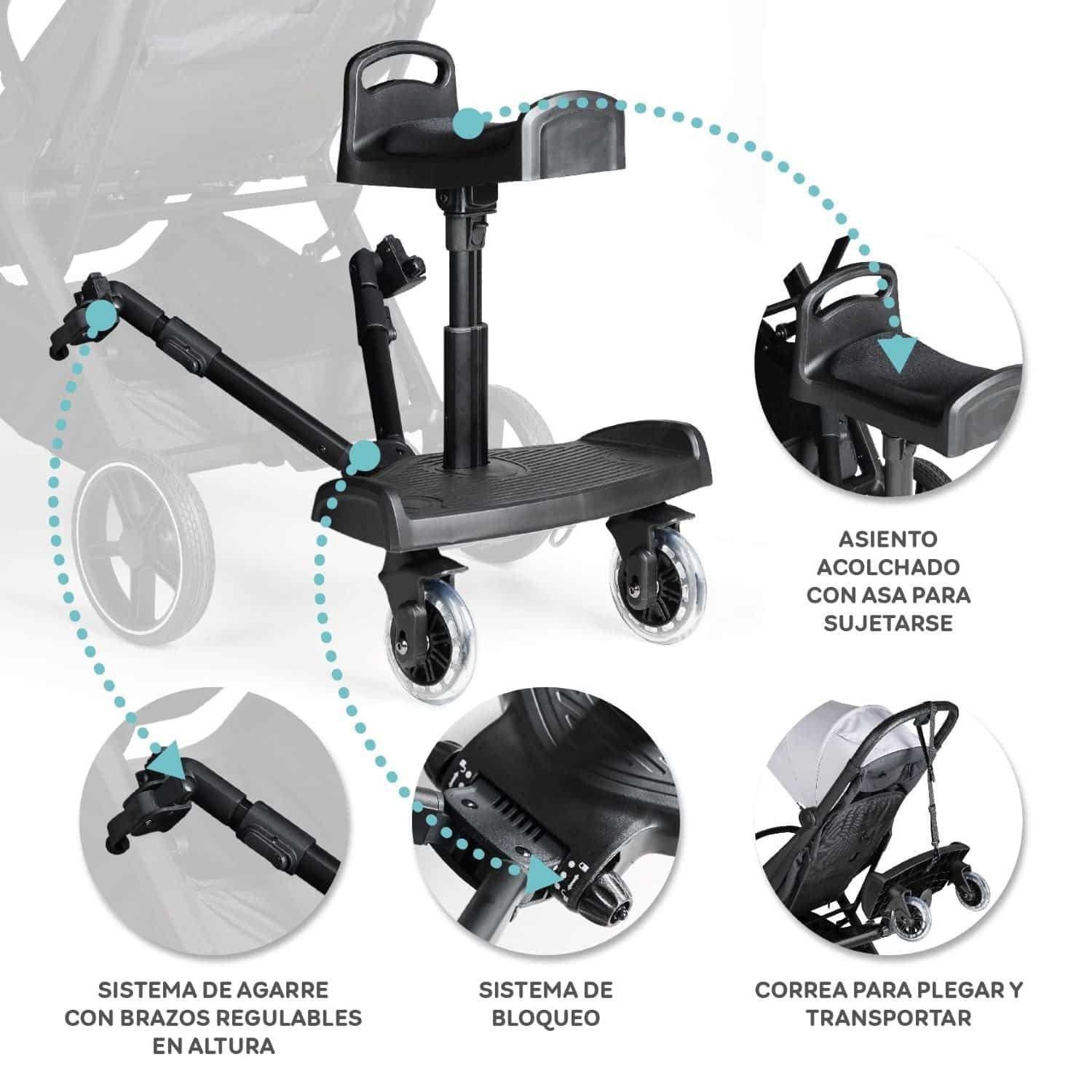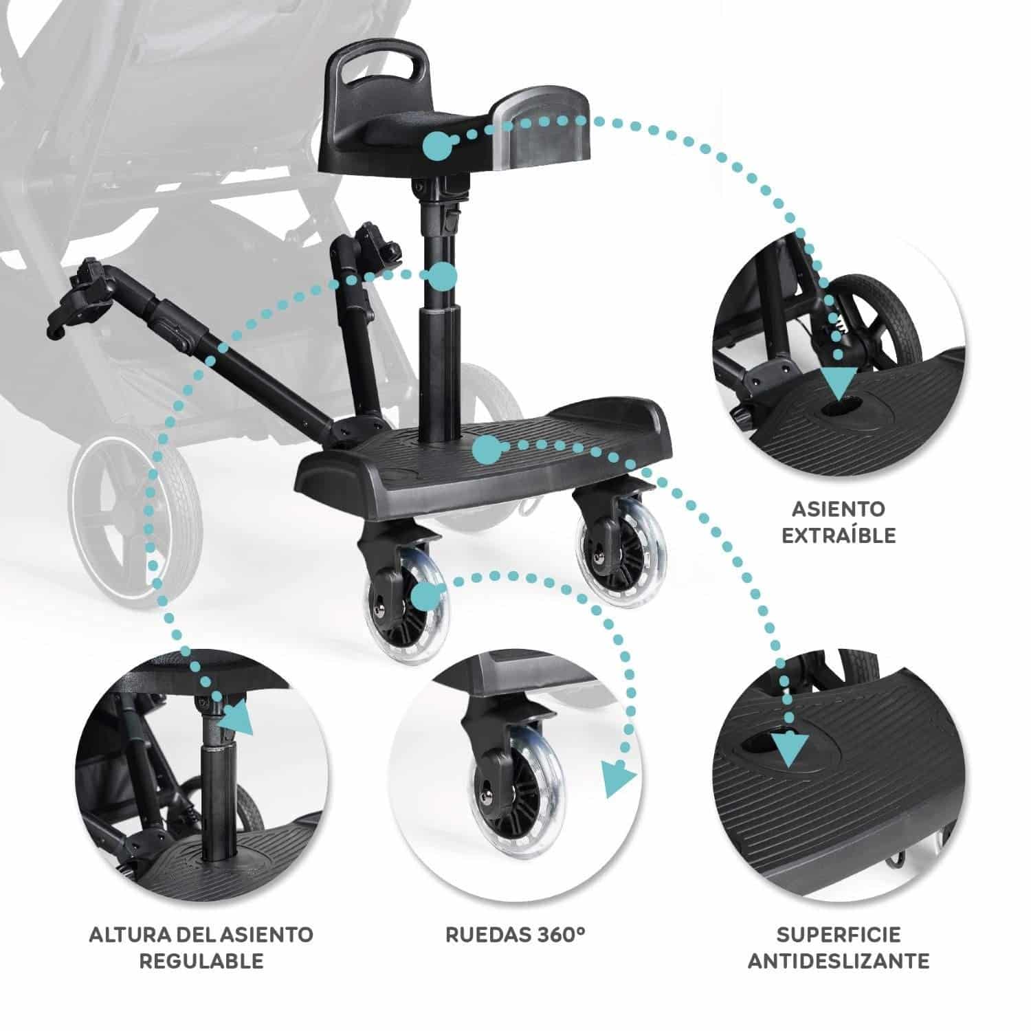 Es ajustable en longitud, ancho y altura, compatible con cualquier silla de paseo. El asiento removible permite que el niño vaya sentado o de pie según prefiera.