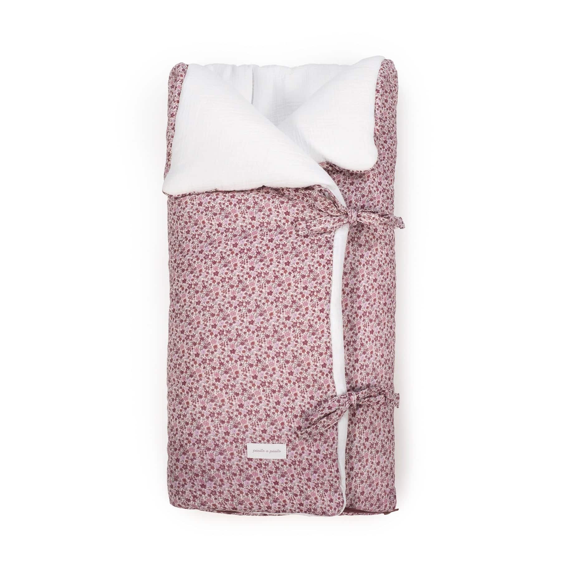 Saco arrullo o manta Cherry Flores de Pasito a Pasito: exterior de muselina estampada 100% algodón y interior de muselina 70% bambú y 30% algodón. Ideal para los primeros días y paseos del bebé, se convierte en manta para la cuna. Cierre tipo sobre con lazos y cremallera inferior para mantener al bebé abrigado. Fabricado con materiales seguros y de gran calidad, fácil de lavar a máquina a 30 °C.
