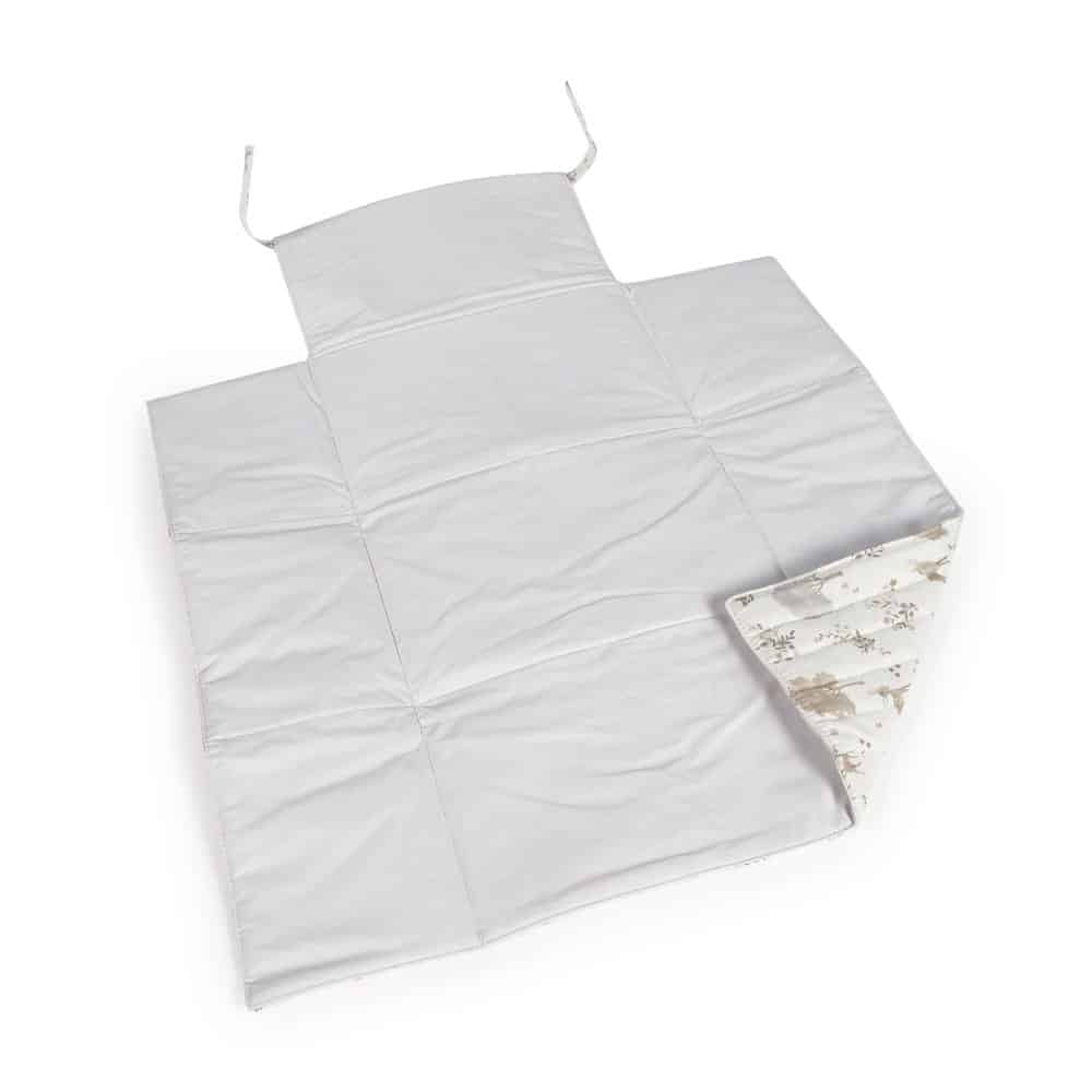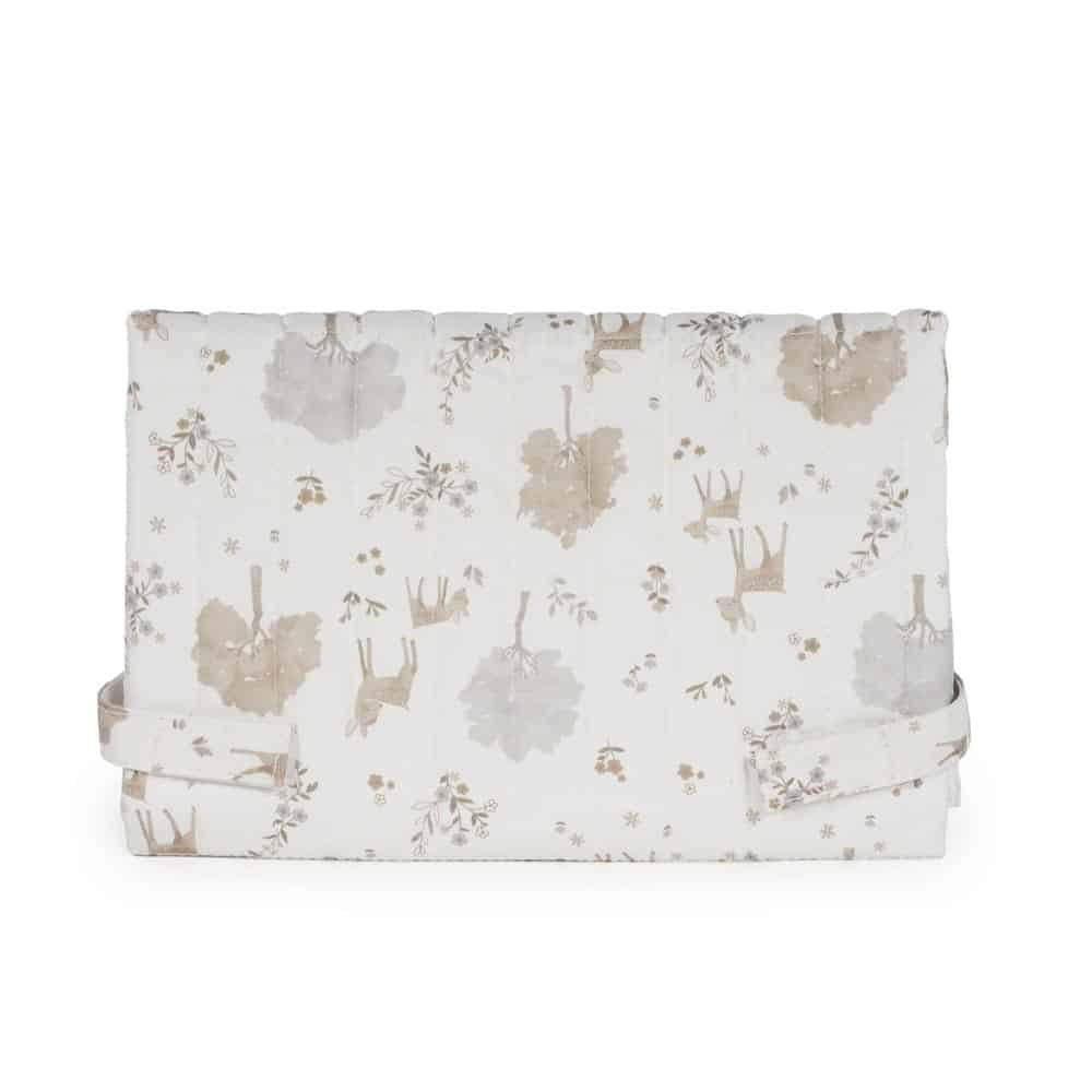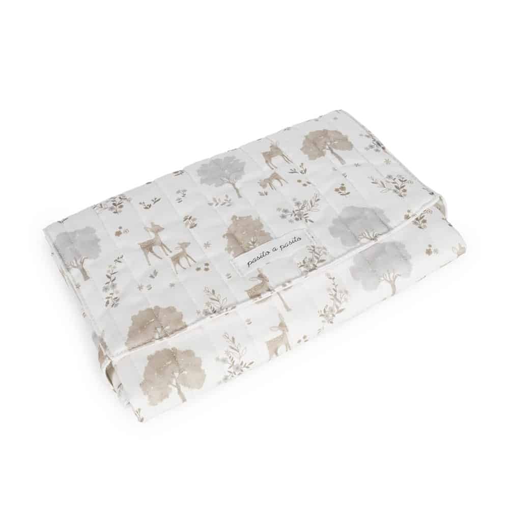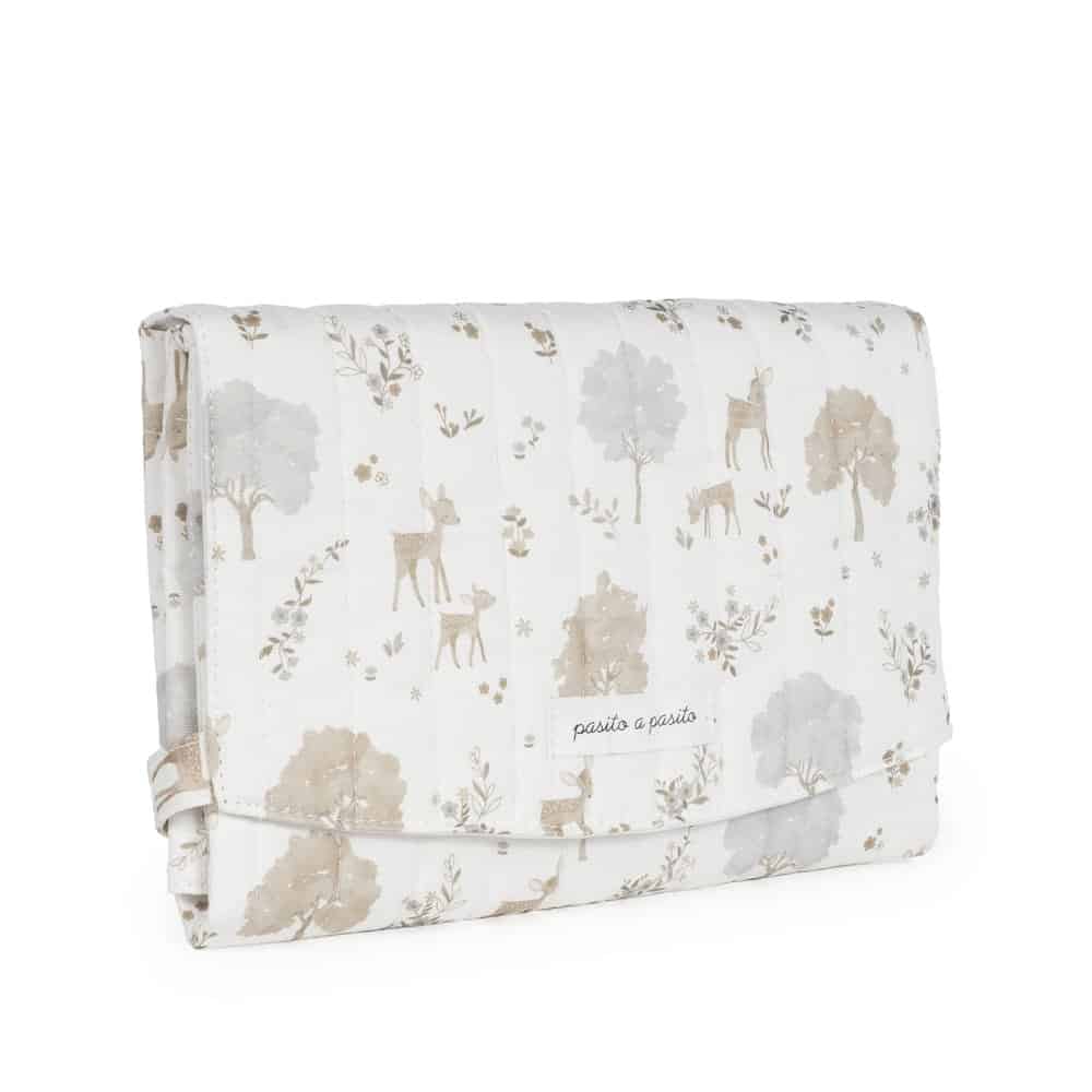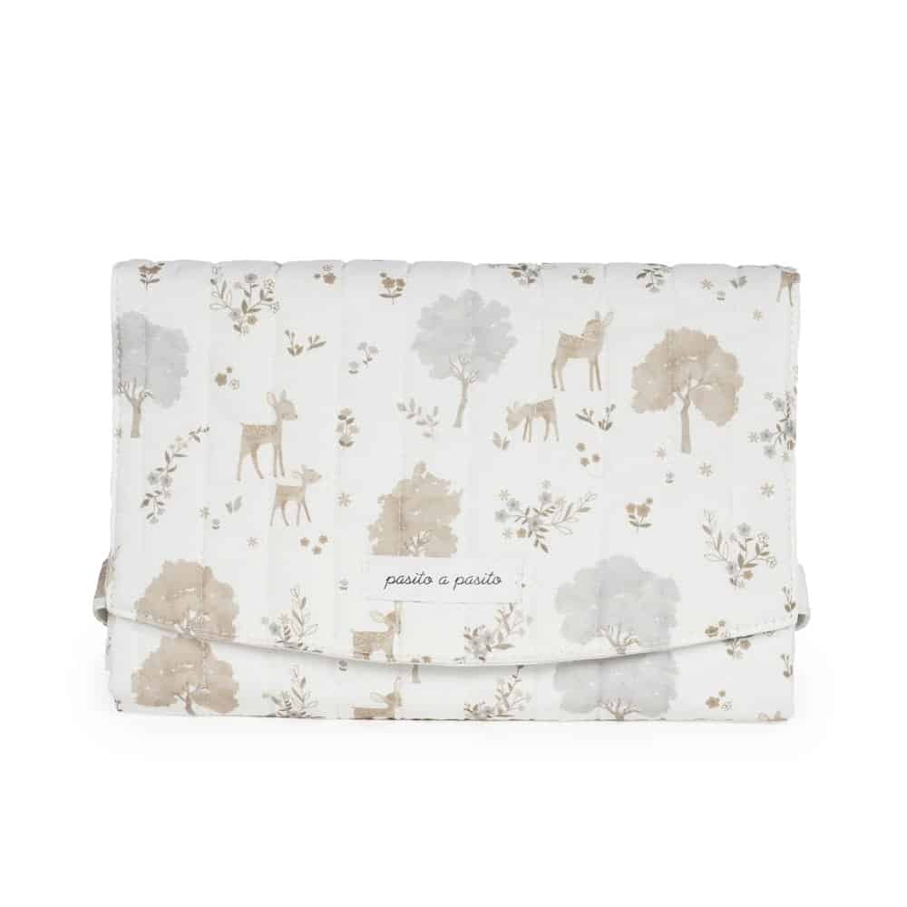 Cambiador Nara de Pasito a Pasito, confeccionado en loneta 100% algodón con estampado de ciervos y árboles en tonos neutros. Plegable, ligero y fácil de transportar, incluye cierre con cintas para mantenerlo compacto dentro de la bolsa. Forro interior acolchado e impermeable para una limpieza sencilla y mayor comodidad. Fabricado con materiales de alta calidad, libres de sustancias nocivas. Medidas: 50×70 cm.