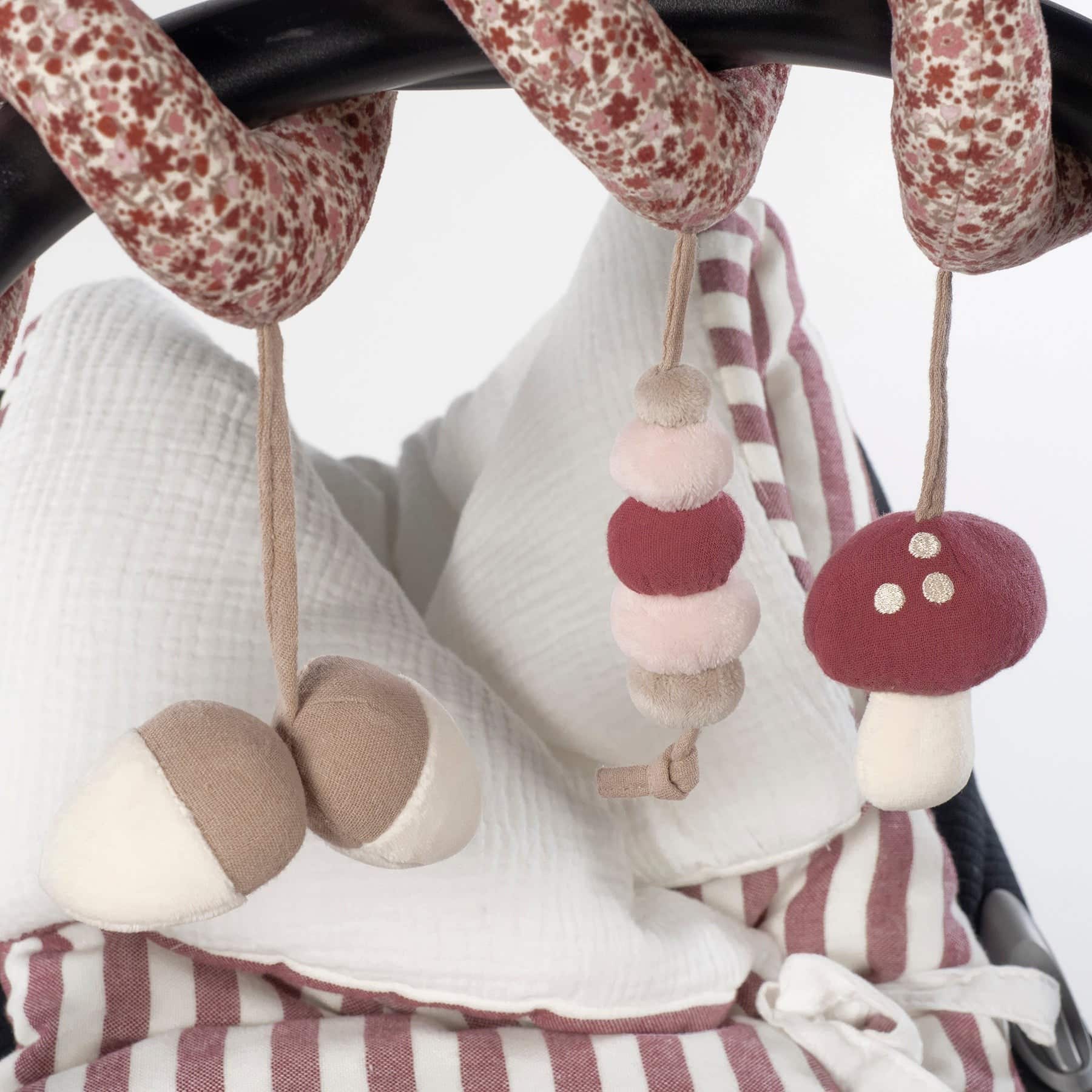 El juguete espiral con ardilla Cherry Flores de Pasito a Pasito está fabricado en velour ultrasuave y se engancha fácilmente al cochecito o a la silla de auto. Incluye colgantes con diferentes texturas, formas y sonidos que estimulan el desarrollo sensorial del bebé. Su diseño en tonos neutros es adorable y seguro, sin piezas pequeñas ni elementos peligrosos. Cumple con la normativa europea EN-71 para seguridad de los juguetes.