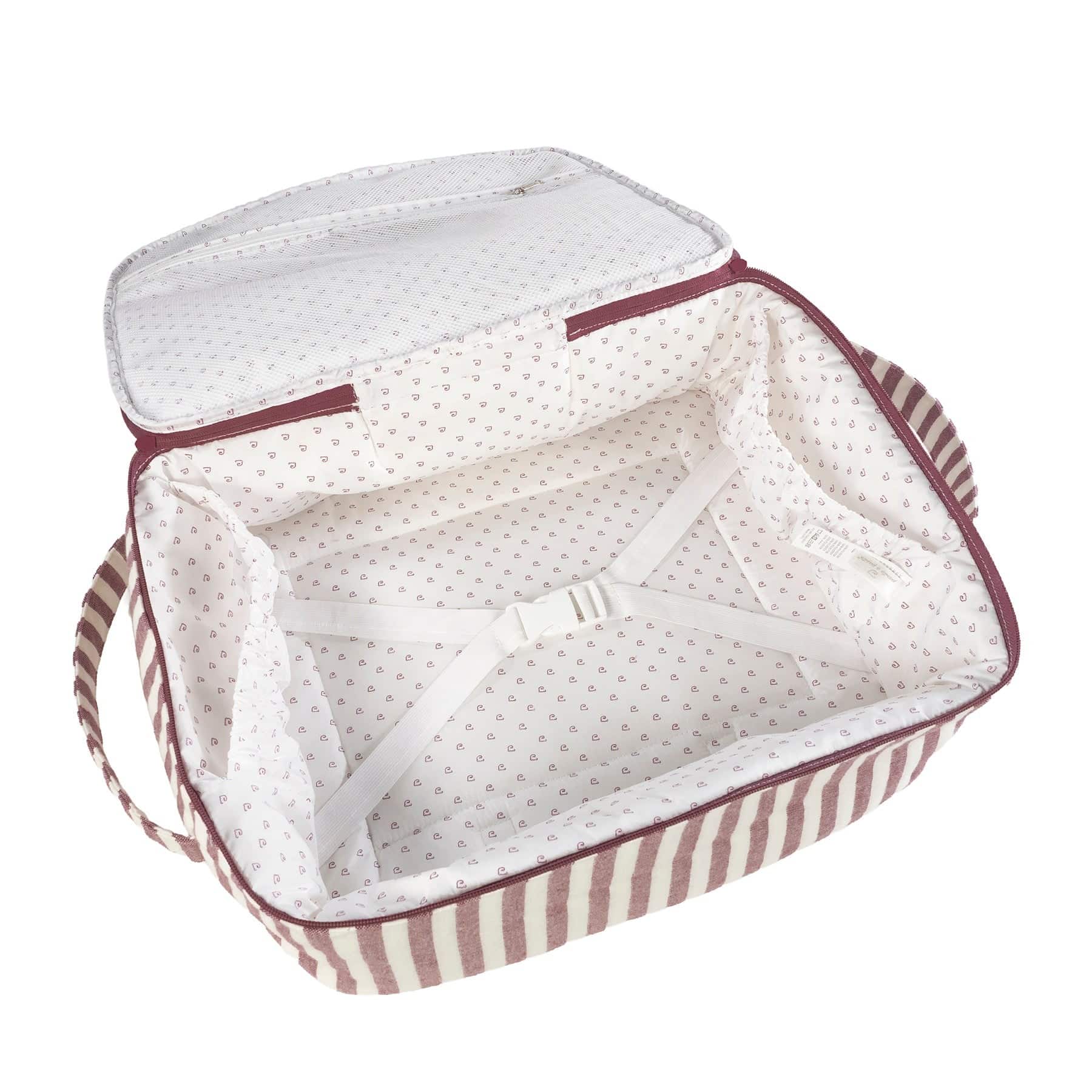 Incluye asa larga para colgar al hombro y dos asas cortas para llevar en la mano. El interior está forrado y cuenta con gomas de sujeción para la ropita, además de una cremallera doble que permite abrir la tapa completamente.
