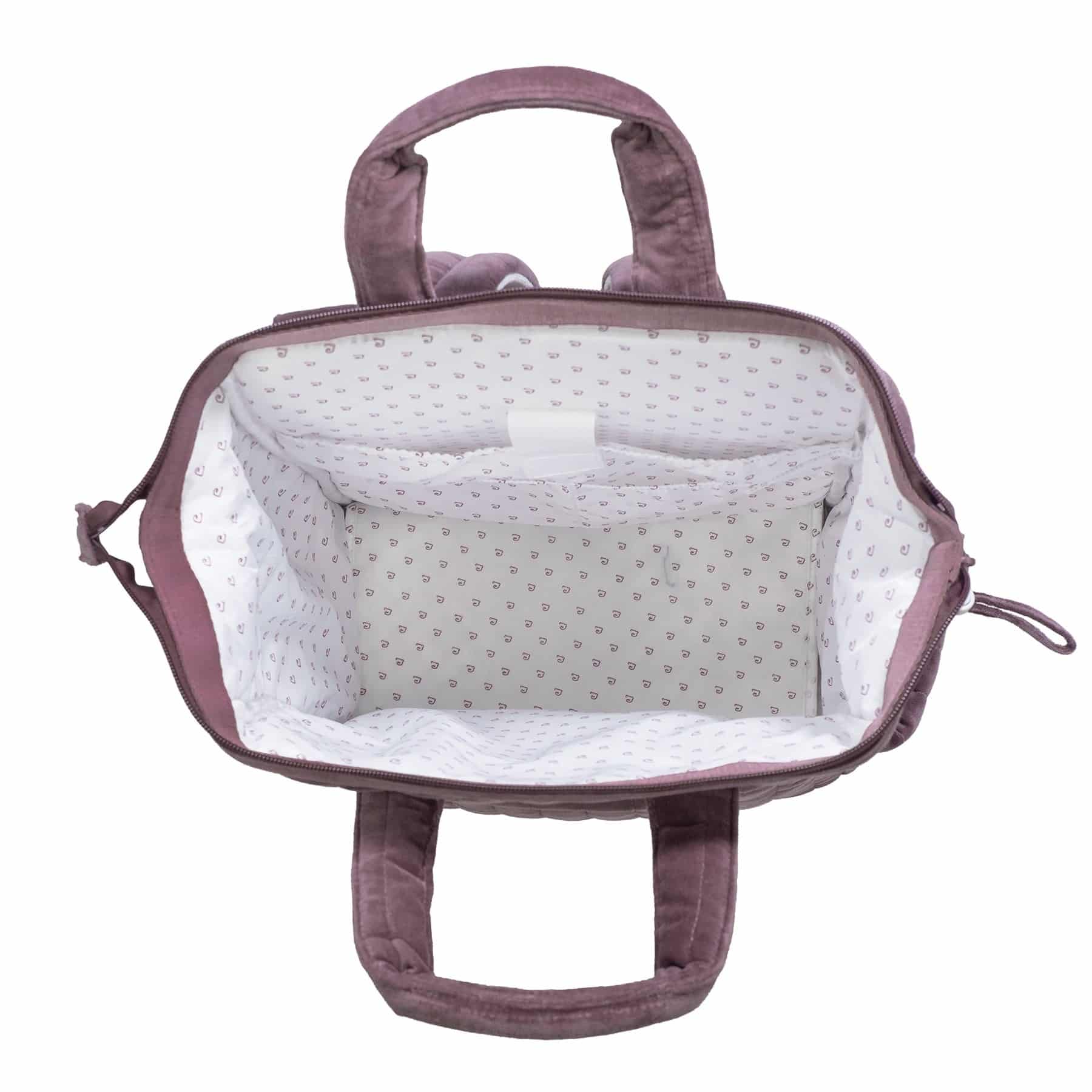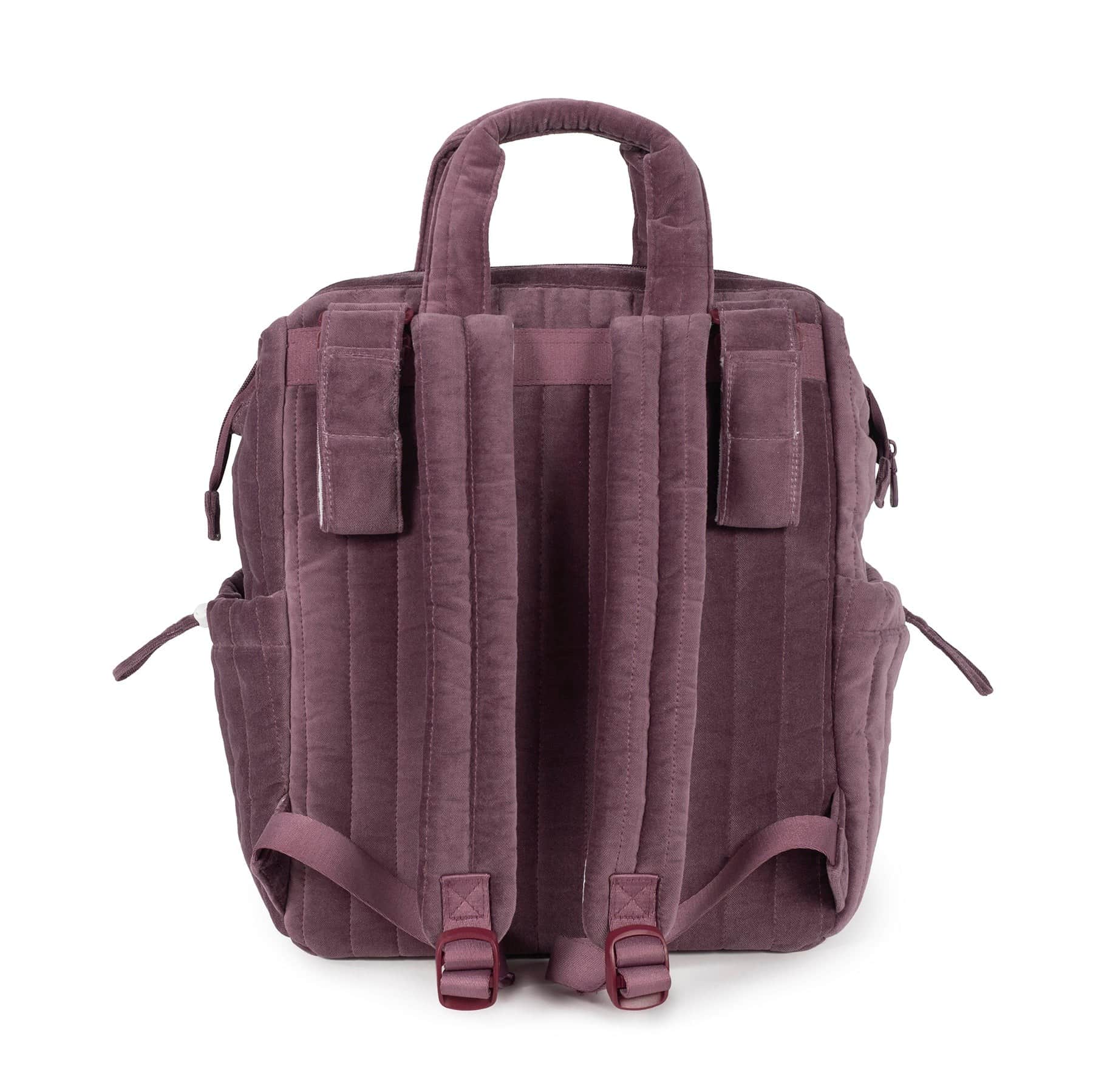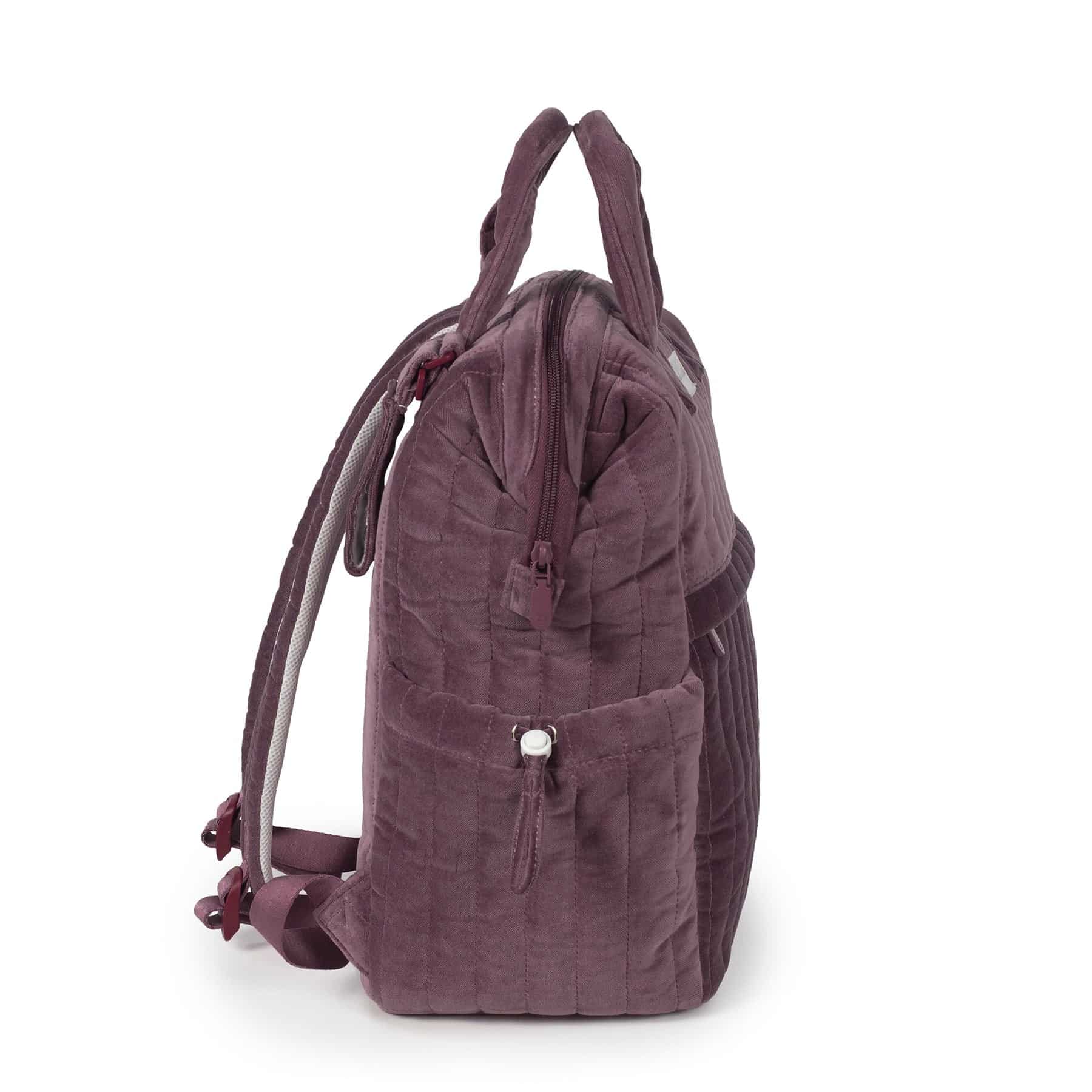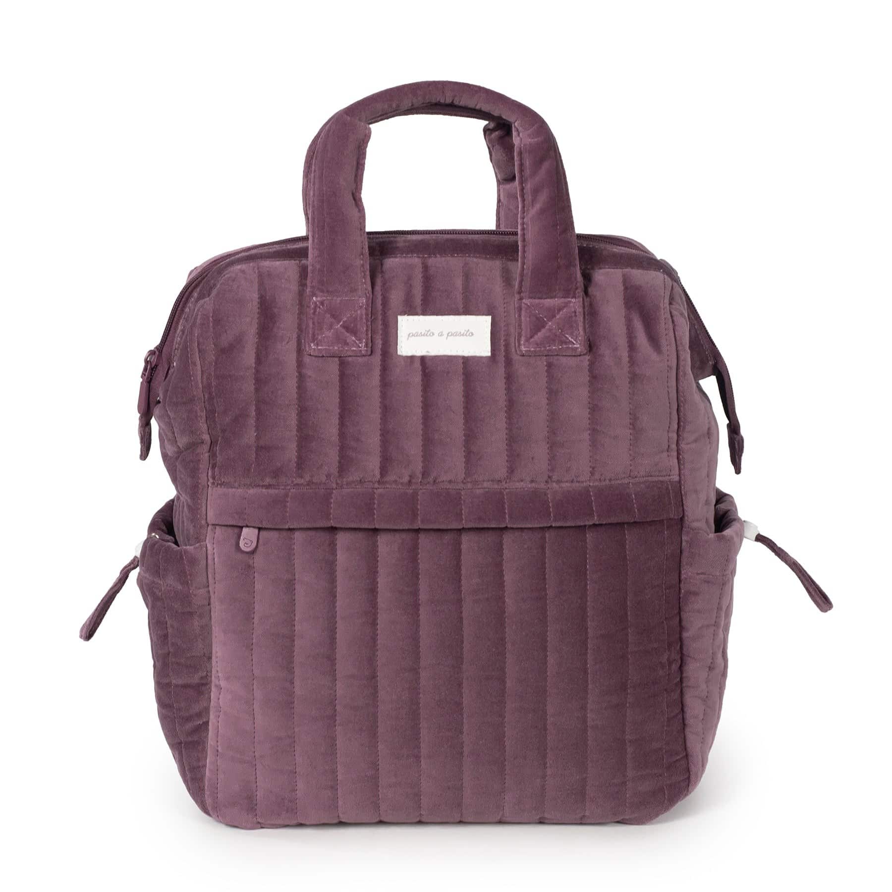 La mochila maternal Cherry Velvet de Pasito a Pasito está confeccionada en terciopelo de algodón 100% con tratamiento waterproof, resistente al agua y duradera. Cuenta con gran capacidad y múltiples compartimentos, incluidos bolsillos laterales para biberones, y viene con cambiador portátil.