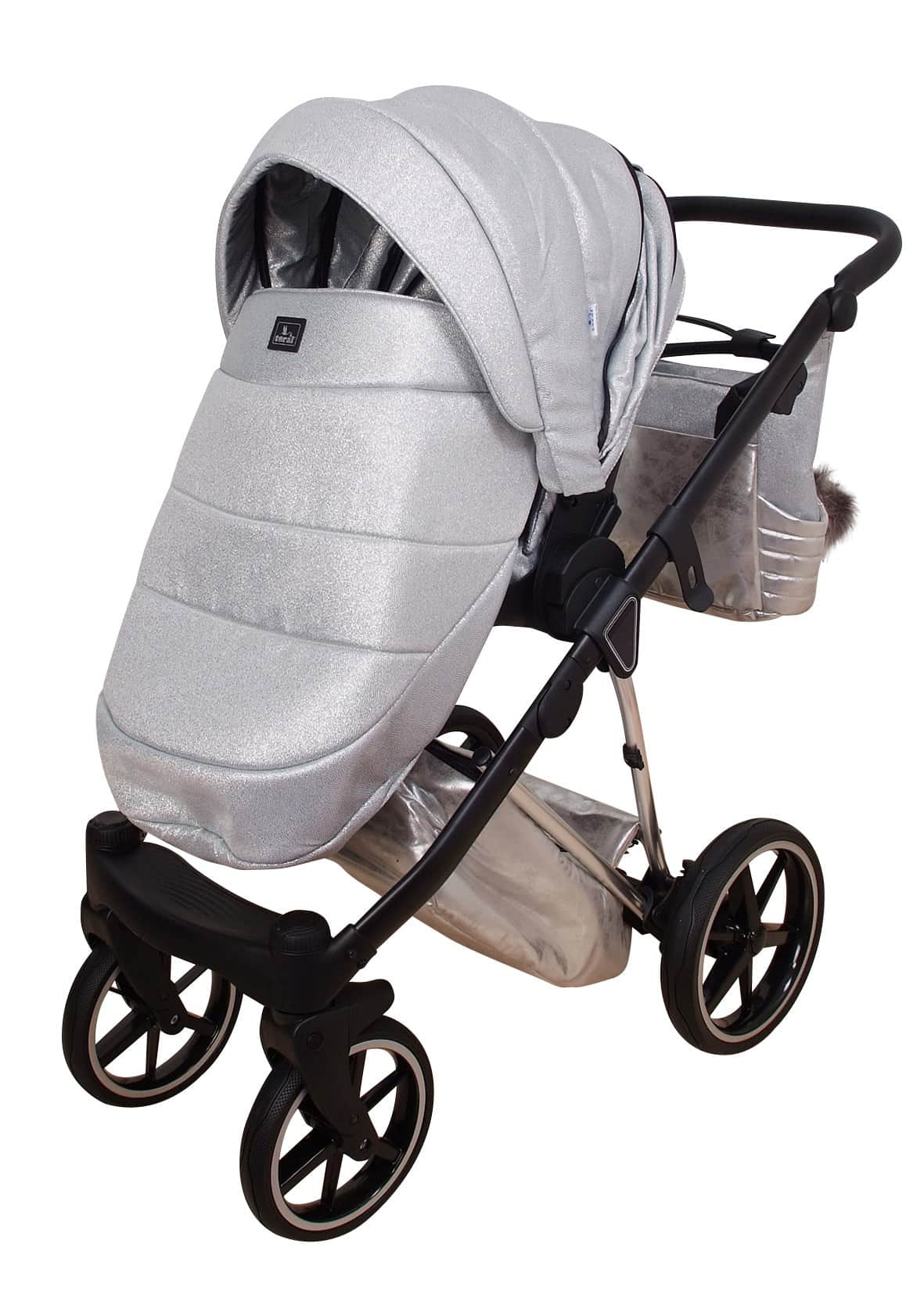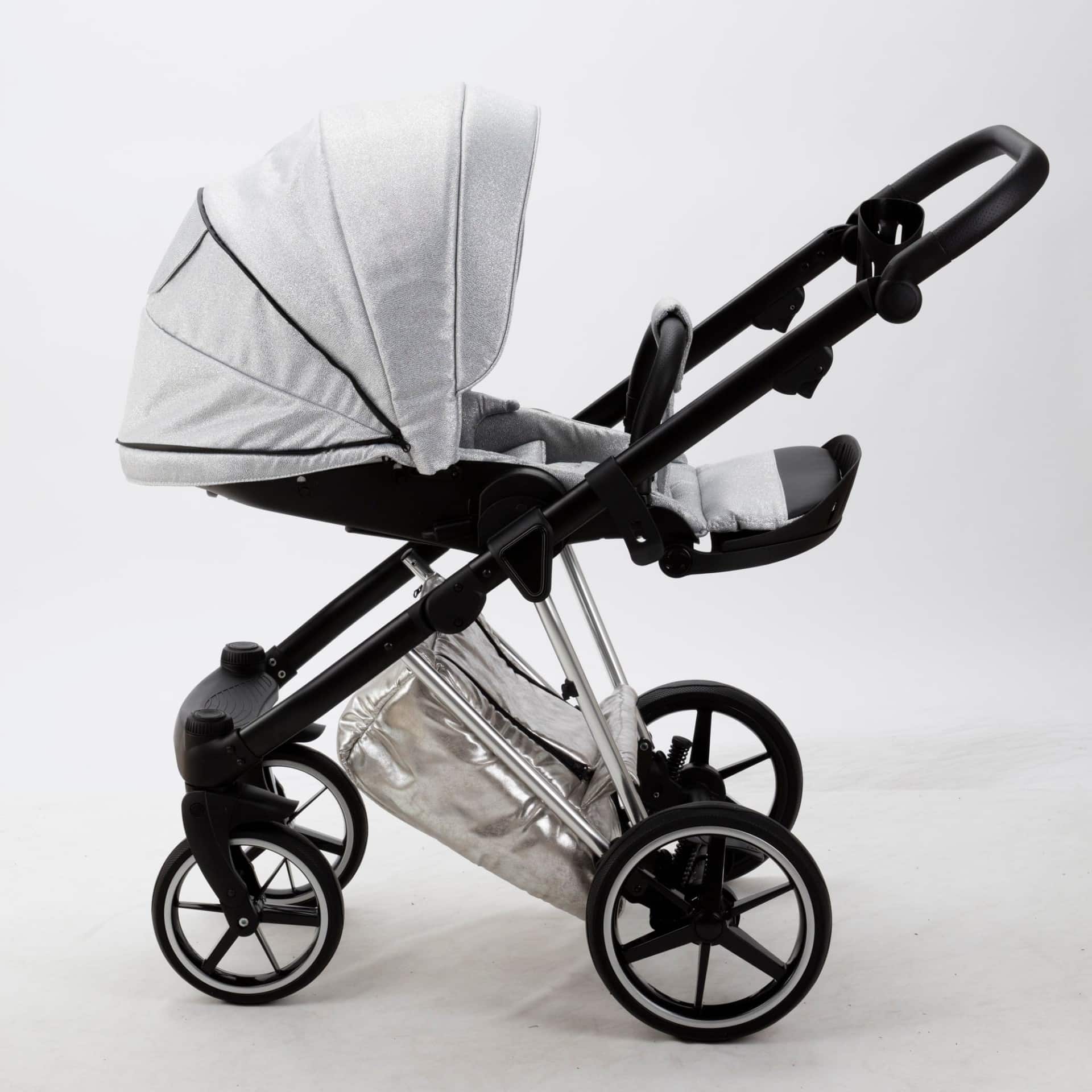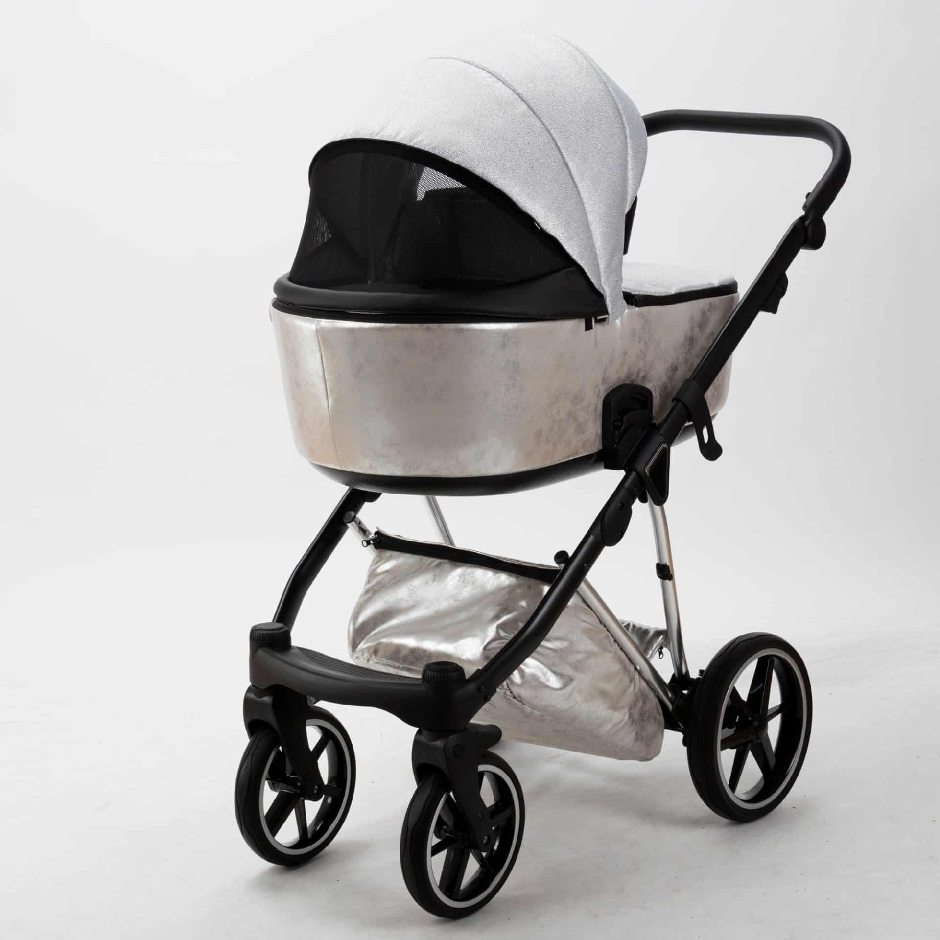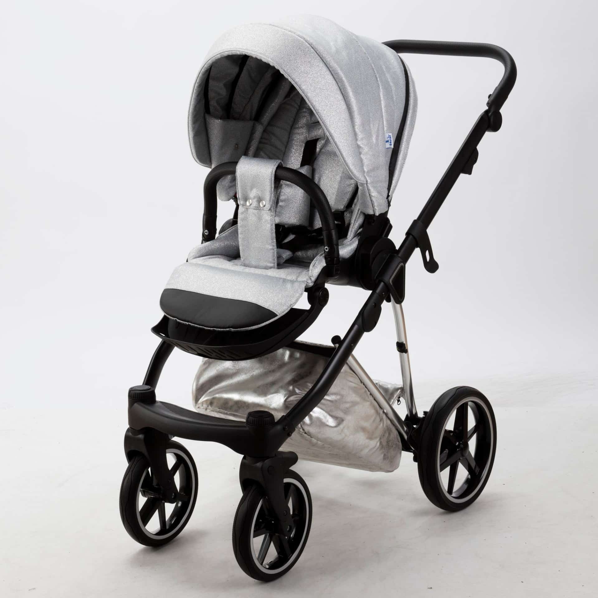 Incluye arnés de cinco puntos, reposabrazos extraíble, reposapiés ajustable, apoyacabeza en capazo y asiento deportivo, bolso, cubrepiés, mosquitera y cojín cambiador.